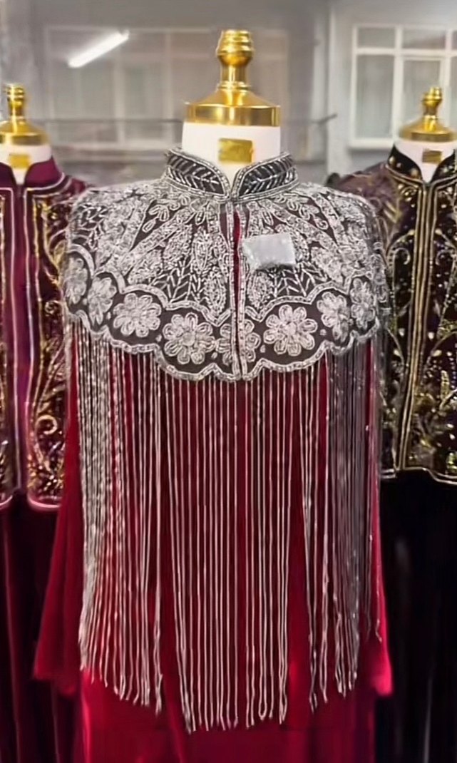 Bordo renkli, uzun kollu, yakalı ve işlemeli püskül detaylı bol kesim uzun elbisedir. Klasik zarafet ve bohem tarzda düğünler için uygundur. El işlemeli