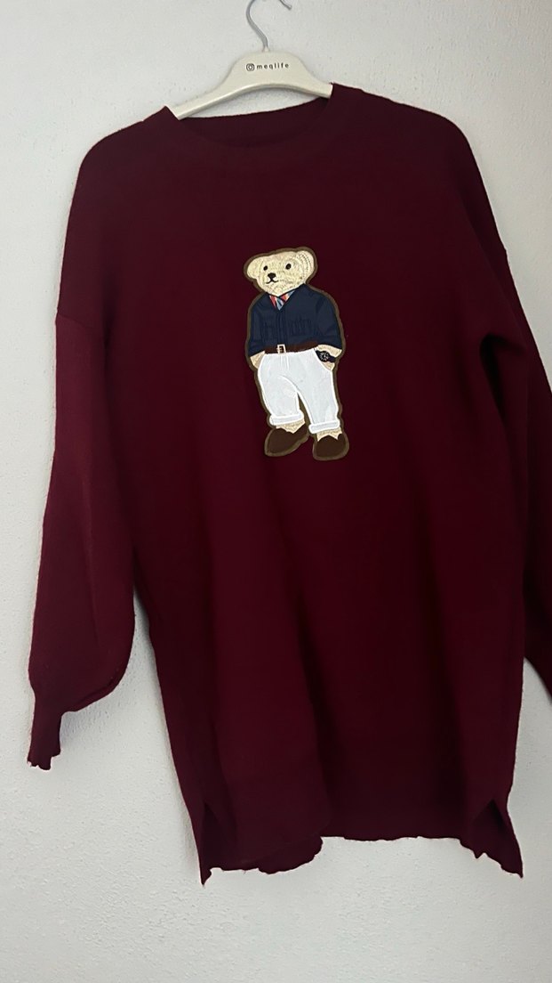 Bordo renkli, rahat kesim, uzun kollu ve yuvarlak yakalı yumuşak dokulu kazak. Örgü yapısında ve nakışlı ayı figürü bulunur, günlük rahat stil için uygundur. Çok az kullandım 2,3 defa