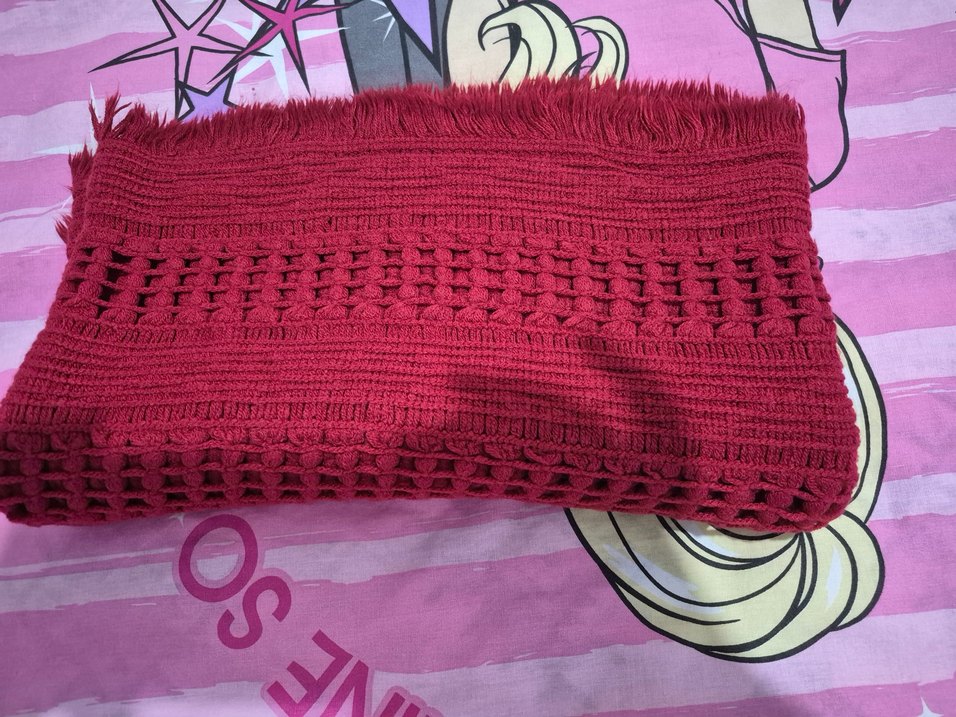 Bordo renkte, nakışlı ve dokulu desene sahip, püsküllü kenarları olan renkli boyunluk. Rahat ve dekoratif bir dokunuş sağlar. ️