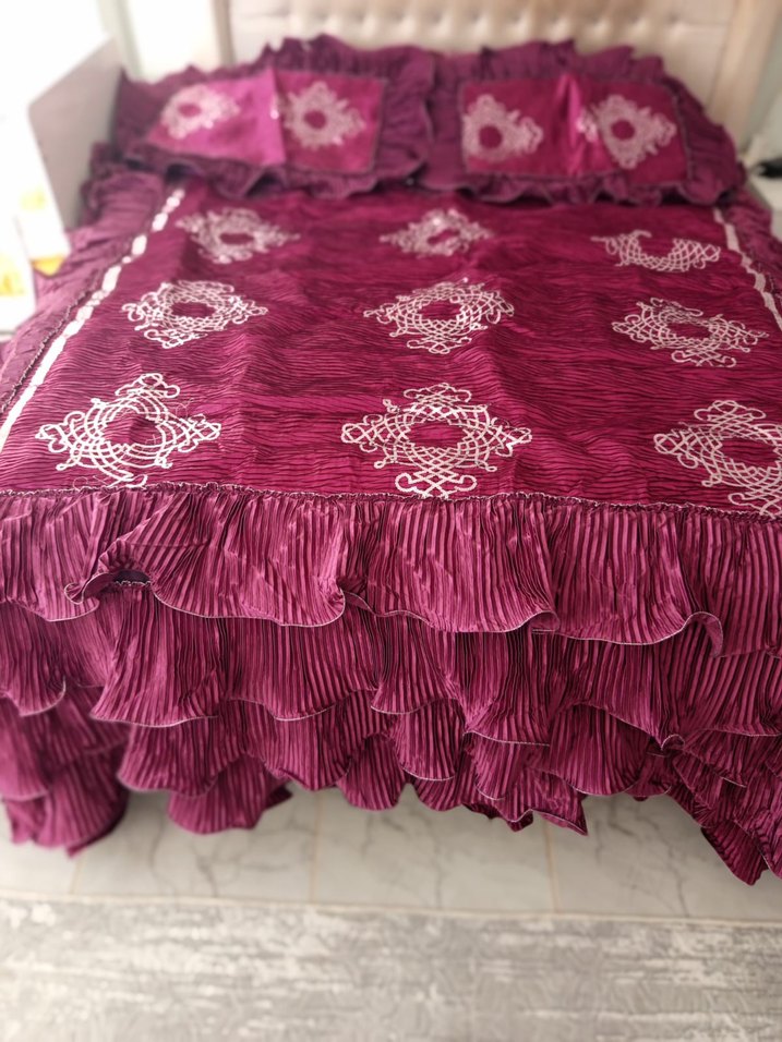 Bordo renkli, nakışlı desenlere ve fırfırlı kenarlara sahip yatak örtüsü. Uyumu sağlayan yastıklarla birlikte.