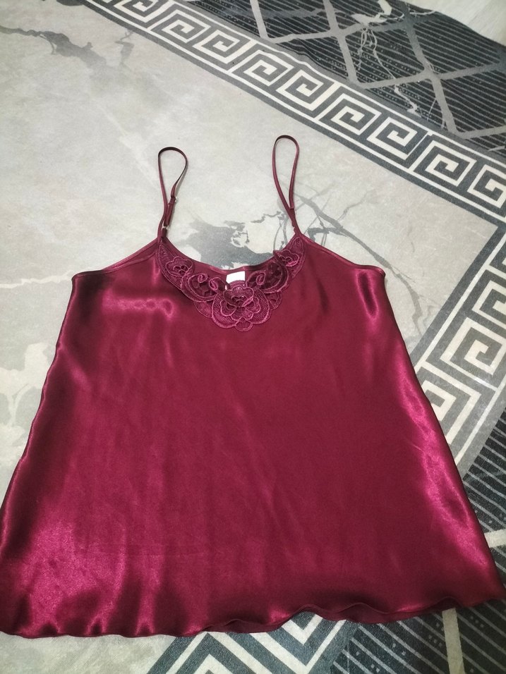 Bordo askılı gecelik, parlak saten kumaş ve yakada nakış detaylarına sahiptir. Gevşek kesim ve midi uzunlukta, rahat ve bohem tarzda.