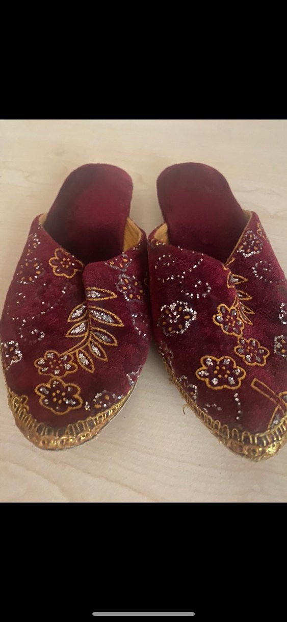 Bordo süet terlik, renkli nakışlı çiçek desenleri ve boncuk detaylı, dolgu topuklu, düğün için uygun.