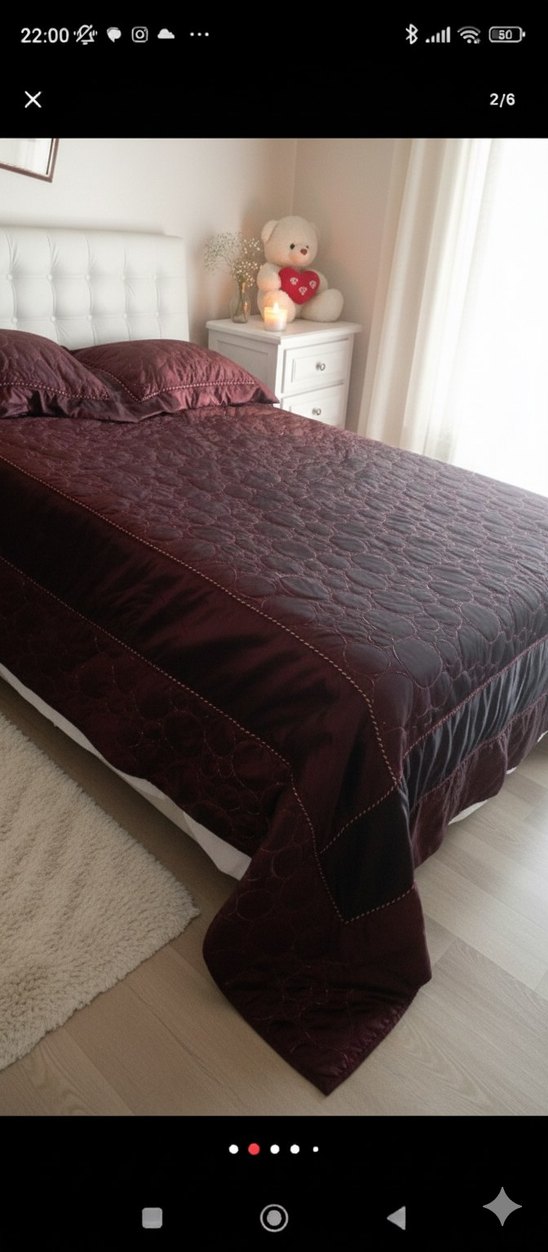 Nakışlı desenli koyu bordo yatak örtüsü, pürüzsüz ve şık dokusu ile yatak odasına zarif bir dokunuş katıyor. ️