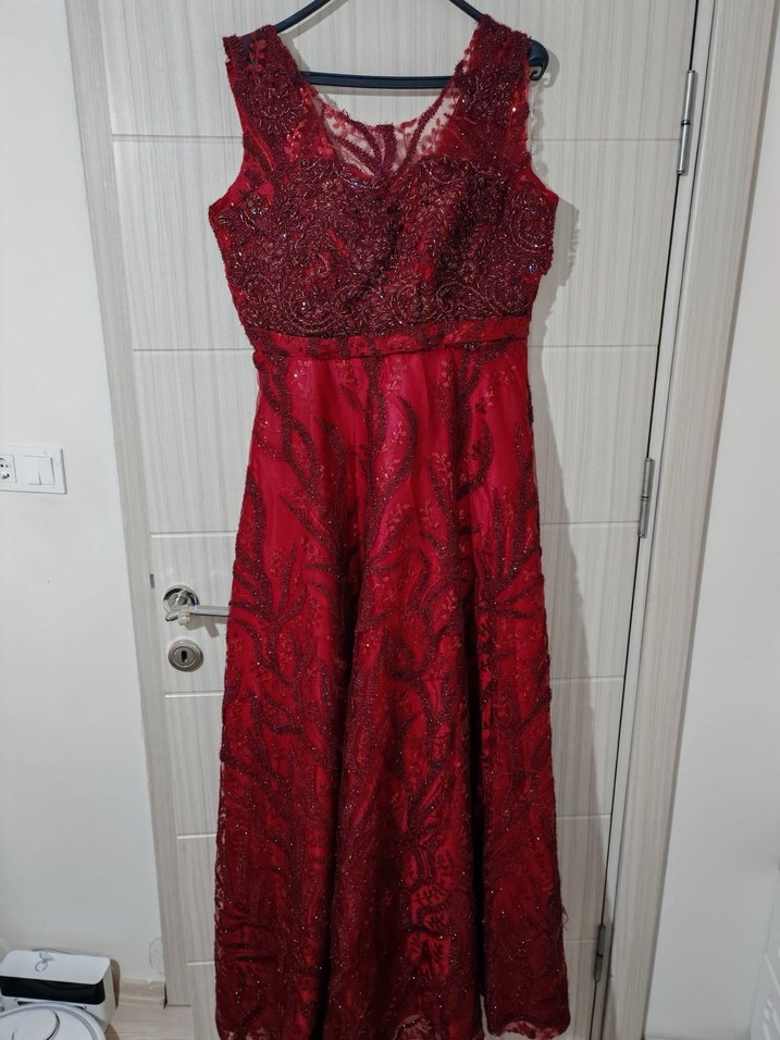 Bordo Nakışlı Uzun Abiye Elbise - Görsel 1