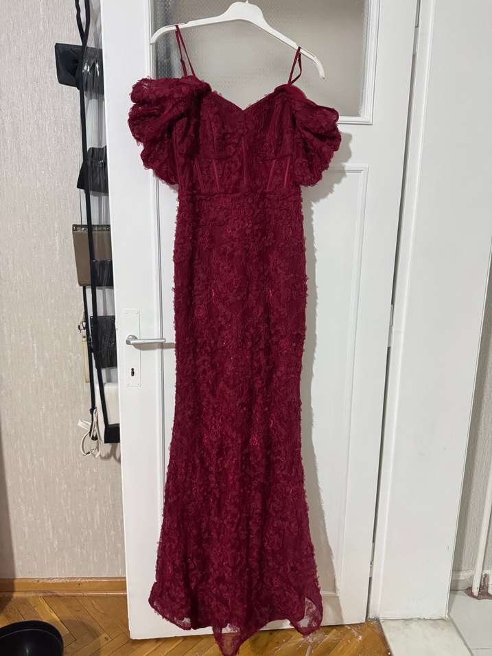 Bordo renkli, nakışlı ve drapeli uzun abiye elbise. Straplez yaka ve ince askılarla klasik ve modern bir şıklık sunar.
