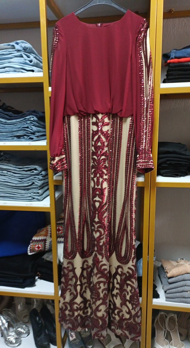Bordo renkli uzun kollu elbise, nakış detayları ve drapeli tasarımıyla bohem tarzını yansıtır. Yuvarlak yaka ve düğünler için uygun.
