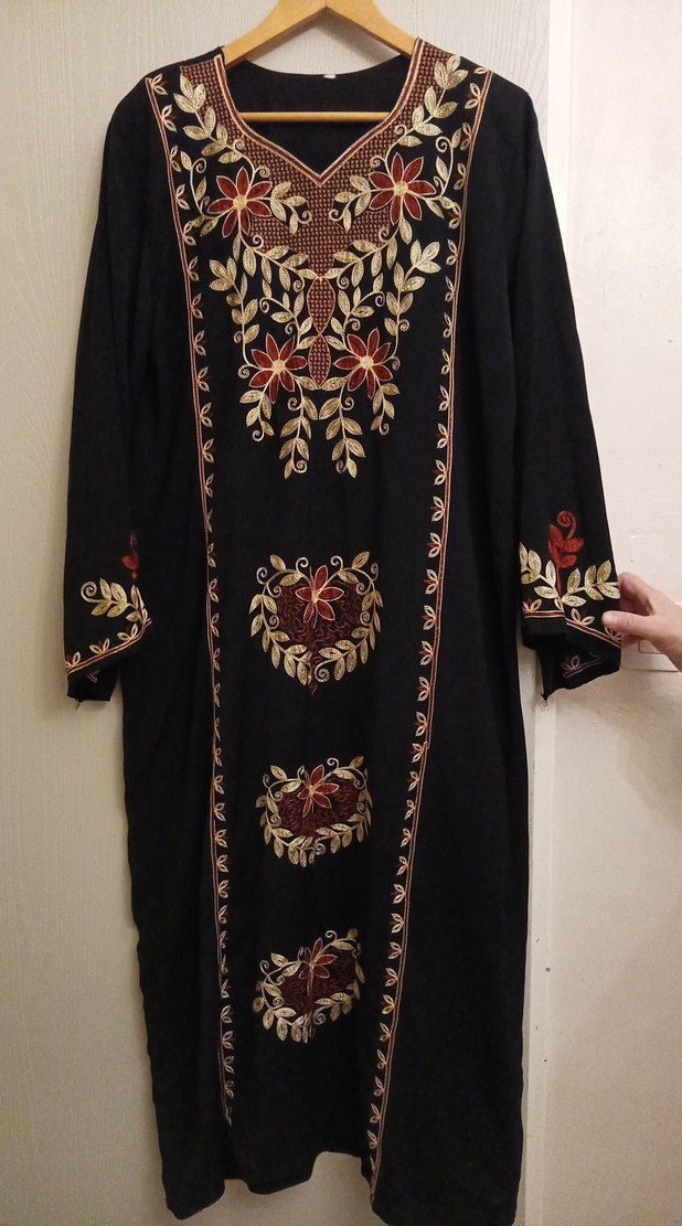 Bordo renkli, nakış işlemeli uzun elbise. Salaş kesim, drapeli uzun kollu ve yakası kesik yakalıdır. Bohem tarzına uygundur.(Hacdan gelmiştir