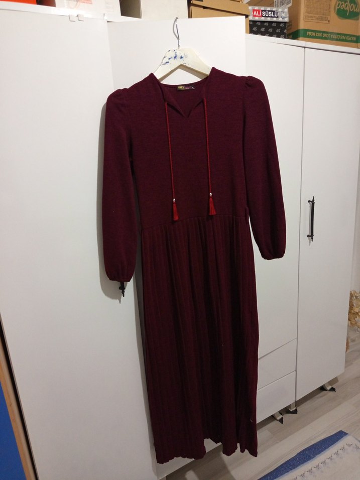 Bordo renkli, nakış detaylı ve püsküllü uzun triko elbise. Bol kesim, uzun kollu ve V yakalı, rahat bohem tarzını yansıtıyor. Günlük kullanıma uygun.