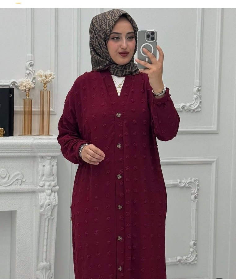 Bordo Nakışlı Uzun Düğmeli Tesettür Tunik