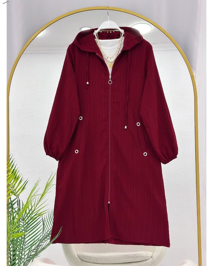 Bordo Nakışlı Uzun Fermuarlı Kadın Yağmurluk