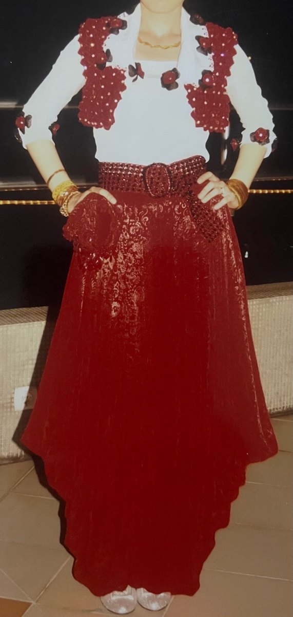 Parlak bordo renkte, nakışlı desenli, straplez ve bol kesim uzun elbise. Drapeli tasarımı ve kolsuz yapısıyla düğünler için uygundur. Dimija Boşnak Kına