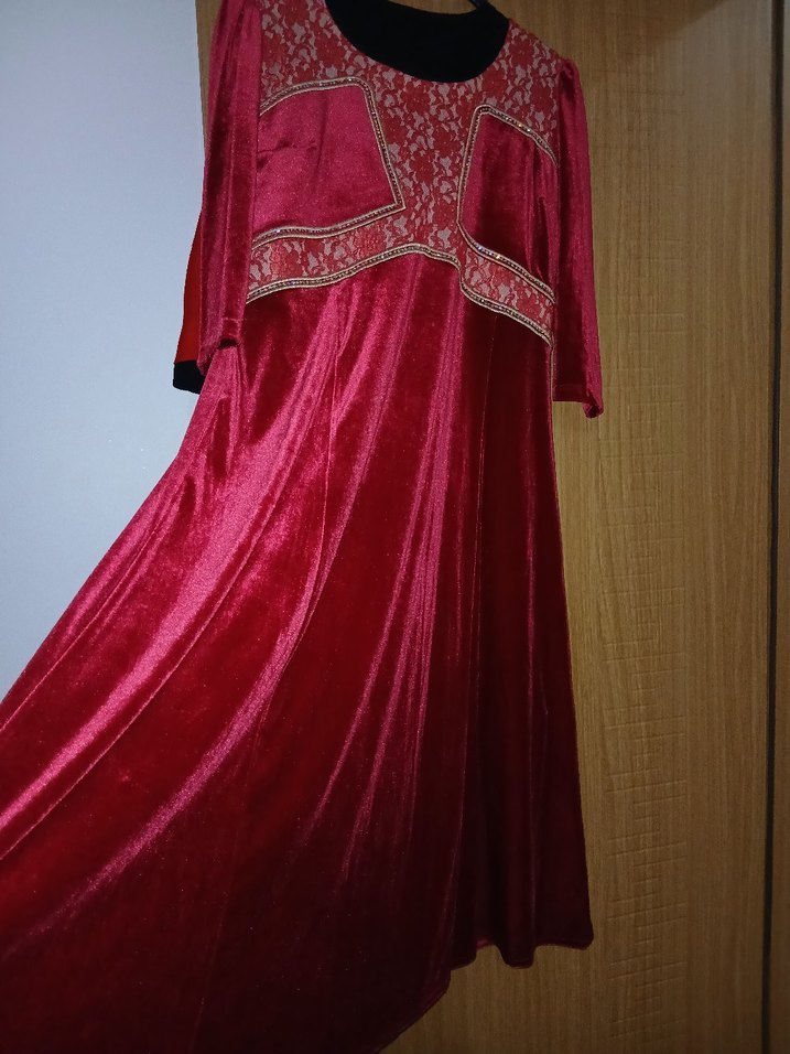 Bordo renkli, uzun kollu, V yakalı kadife elbise, ipeksi kumaştan ve nakışlı desenlerle tasarlanmıştır. Salaş kesimi ve drapeli detaylarıyla düğünler için uygundur. ✨