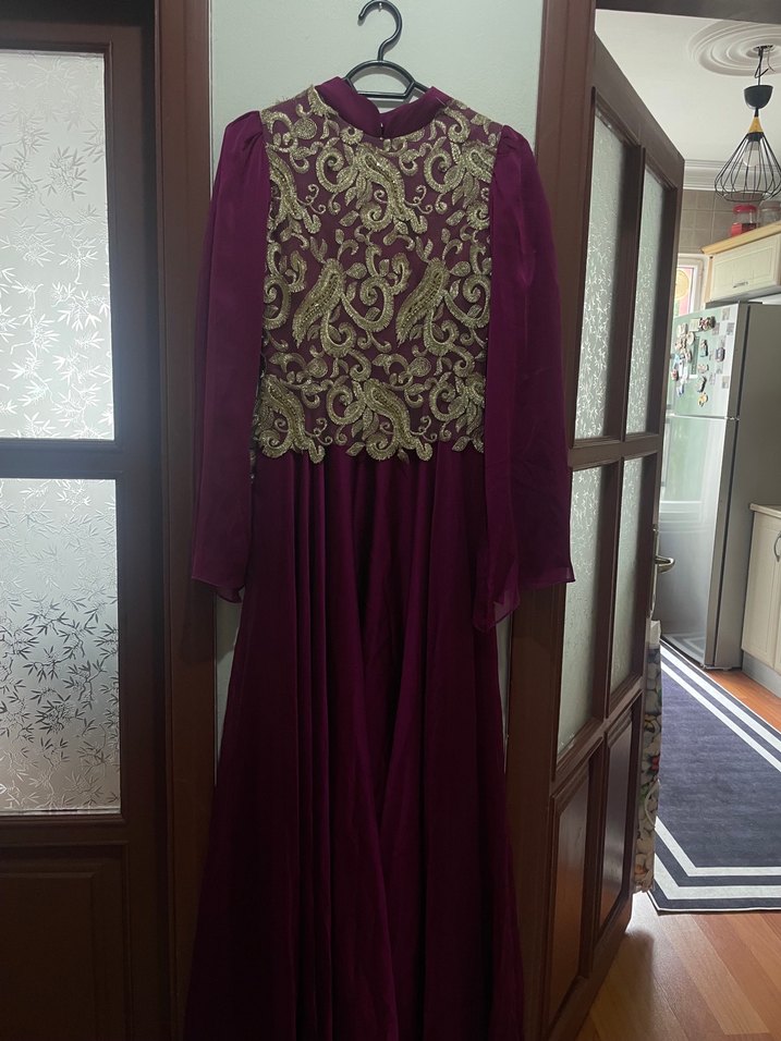 Bordo renkte, nakışlı işlemeli üst kısmı ve uzun kollu, yüksek yakalı uzun bindallı elbise. Salaş kesimi ve drapeli stiliyle vintage düğünlere uygun.