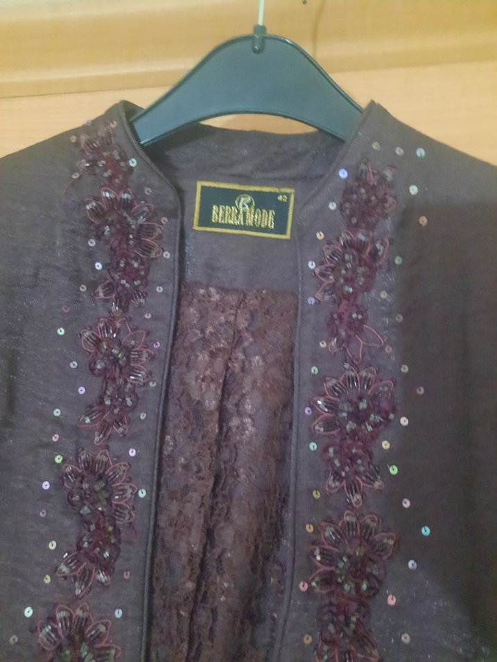 Bordo renkte, uzun boyutta, nakış işlemeli ve düğmeli kadın ceketi. Notched lapel yakaya sahip, tekstil kumaştan, bohem ve vintage tarzına uygun, düğün için ideal.