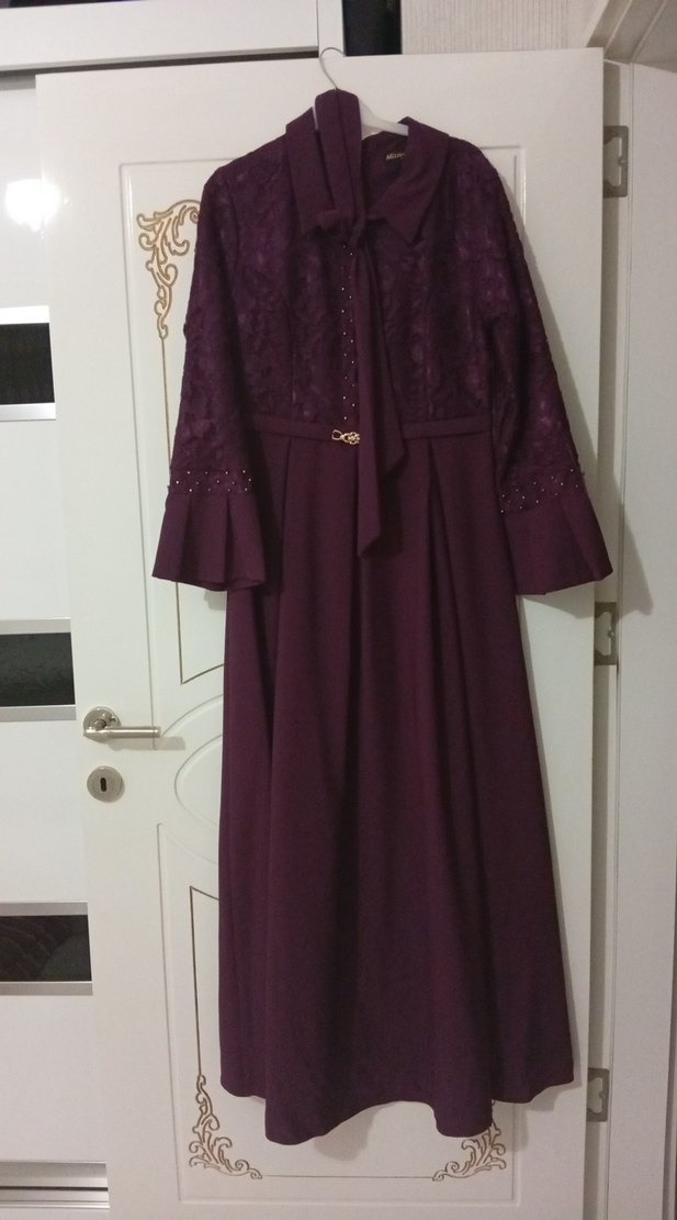 Bordo uzun elbise, yakalı ve uzun kolludur. Bol kesim ve drapeli tasarımı klasik şıklık sunar. Üst kısmı ve kolları nakışlıdır. Sentetik kumaştan, düğün için uygundur.