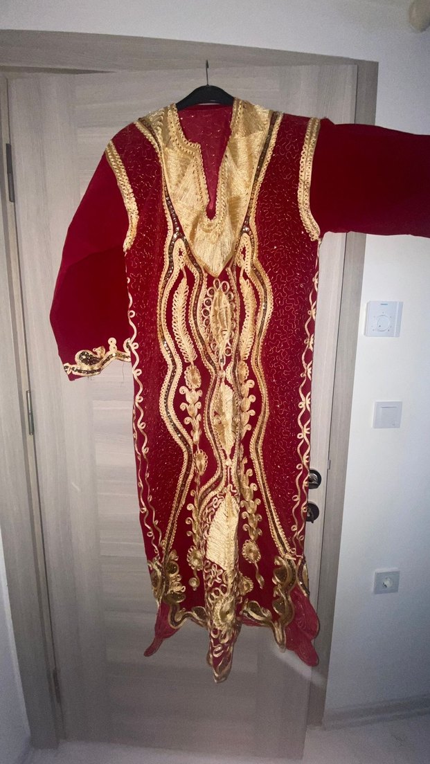 Bordo renkli, altın işlemeli uzun kına elbisesi. Yaka kısmı kesimli, drapeli detaylı ve uzun kolludur. Vücuda oturan kesimiyle bohem düğün stiline uygundur. ✨