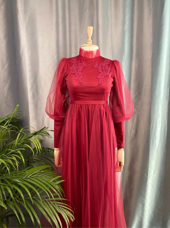 Bordo renkli, yüksek yakalı ve uzun tül kollu bu abiye elbise nakış detaylarına sahip. Dökümlü ve klasik modern tarzda, düğünlere uygun regular fit modeldir. ✨ Ürün Durumu: Hiç kullanılmamış, sıfır, etiketi üzerinde. Model: Tesettür abiye, tül kumaş, yaka kısmında zarif çiçekli nakış detayları, kemerli. Renk: Bordo Beden: 36 Kullanım Alanı: Nişan, düğün, söz, mezuniyet ve özel günler için şık ve zarif bir model. Sınırlı stok; kaçırmayın! #tesettürabiye #bordoabiye #36beden #tülabiye #nakışlıabiye #çiçeklinakış #kemerlikabiye #sıfırabiye #özelgünabiye #nişanelbisesi #düğünabiye