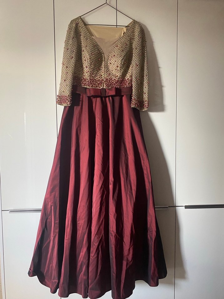 Bordo renkte, uzun kollu, nakışlı ve drapeli üst kısmı ile vintage ve modern klasik tarzı bir araya getiren uzun abiye elbise. Düğünler için uygun. Transparandır. Tesettüre yarı uygundur. Sırt kısmı eklemedir çıkartılabilir.