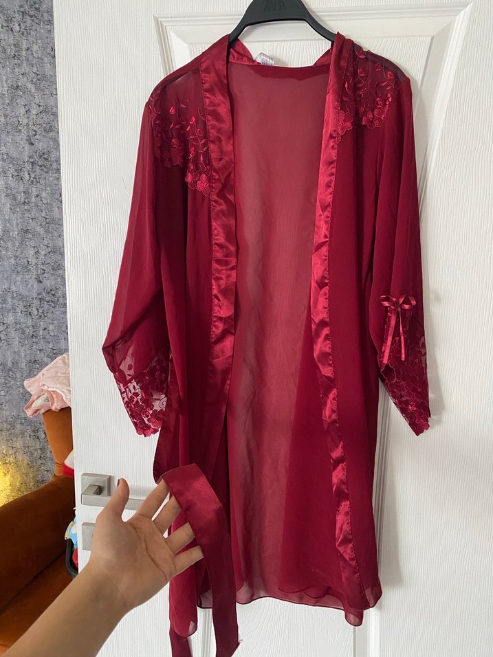 Bordo renkli, uzun kollu ve bol kesim sabahlık. Nakış detayları ve parlak dokusuyla midi boyda, rahat bohem tarzda, kemerli.