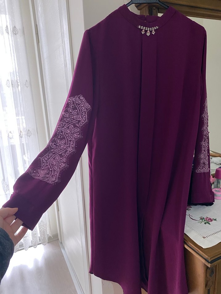 Bordo renkli, uzun ve dökümlü kesime sahip bu tunik, ipeksi kumaftan üretilmiştir. Uzun kollarında nakış detayları ve yüksek yakasıyla bohem ve mütevazı tarzı yansıtır. ✨