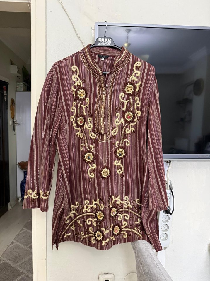 Bordo Nakışlı Uzun Kollu Bohem Vintage Tunik Bluz