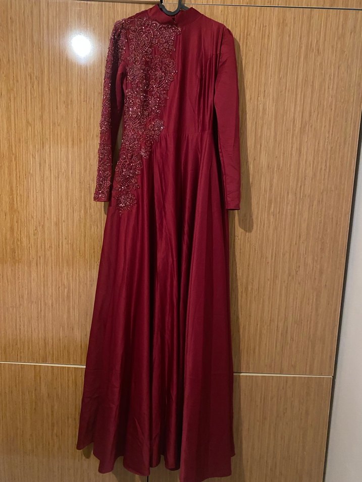 Bordo renkli, parlak kumaştan yapılmış, drapeli ve nakışlı uzun kollu abiye elbise. Yaka kısmı kesimli ve klasik şıklık sunar. Uzunluk 160 cm