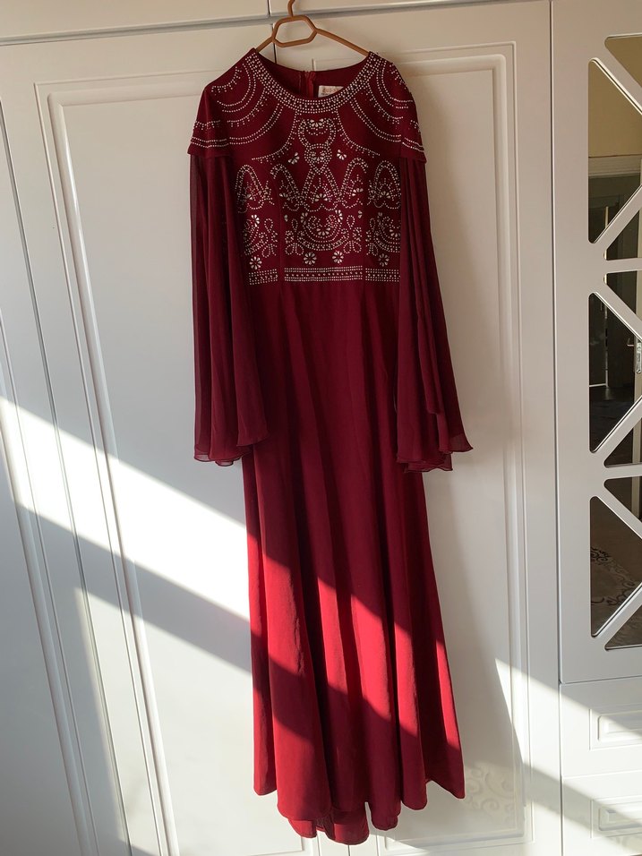 Bordo renkli, yüksek yakalı ve bol kesimli uzun abiye elbise. Uzun drapeli kollara ve detaylı nakışlara sahiptir kına elbisesi olarak 1 kere giyildi