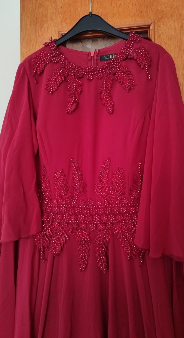 Bordo renkte, uzun kollu ve yüksek yakalı kadın abiye elbise. Nakış detayları ve salaş, drapeli kesimiyle düğünlerde şık tercih.