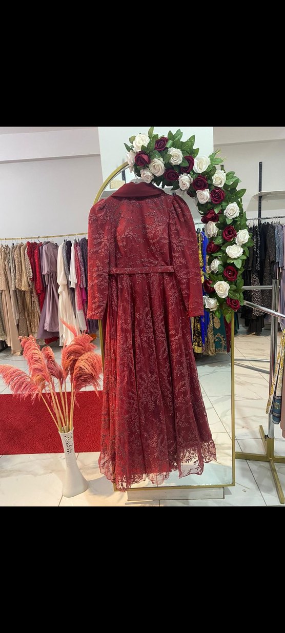 Bordo Nakışlı Uzun Kollu Kadın Abiye Elbise