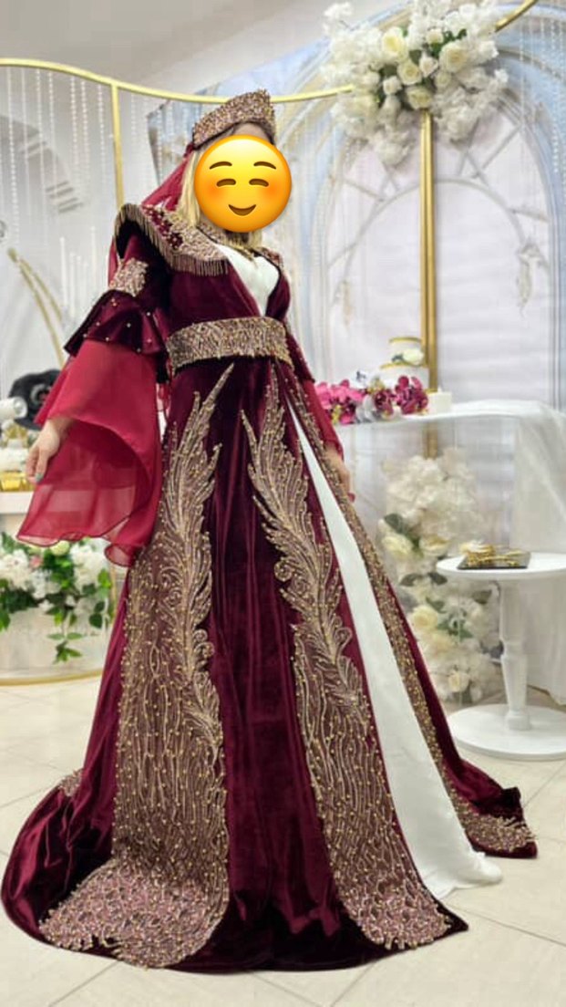 Bordo renkli, işlemeli ve drapeli uzun kollu bindallı, V yaka ve normal kesim ile tesettürlü düğünler için uygundur.