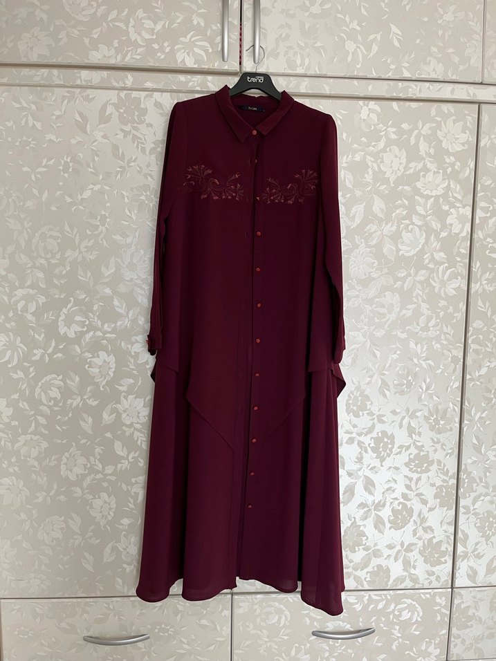 Bordo renkli, nakışlı desenlere sahip, uzun kollu, dökümlü ve bol kesim kadın elbisesi. İpek gibi dokusu ve çentikli yaka detayıyla ofis kullanımı için uygundur.