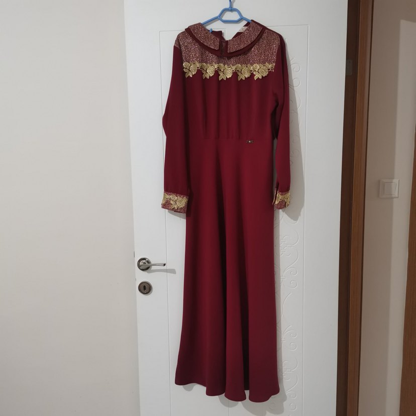 Bordo renkli, yüksek yakalı ve uzun kollu bu elbise, nakışlı manşetlere sahiptir. Bol kesim ve drapeli tasarımıyla düğünler için uygundur. Kumaşı sentetiktir ve minimal, klasik stilde tasarlanmıştır.