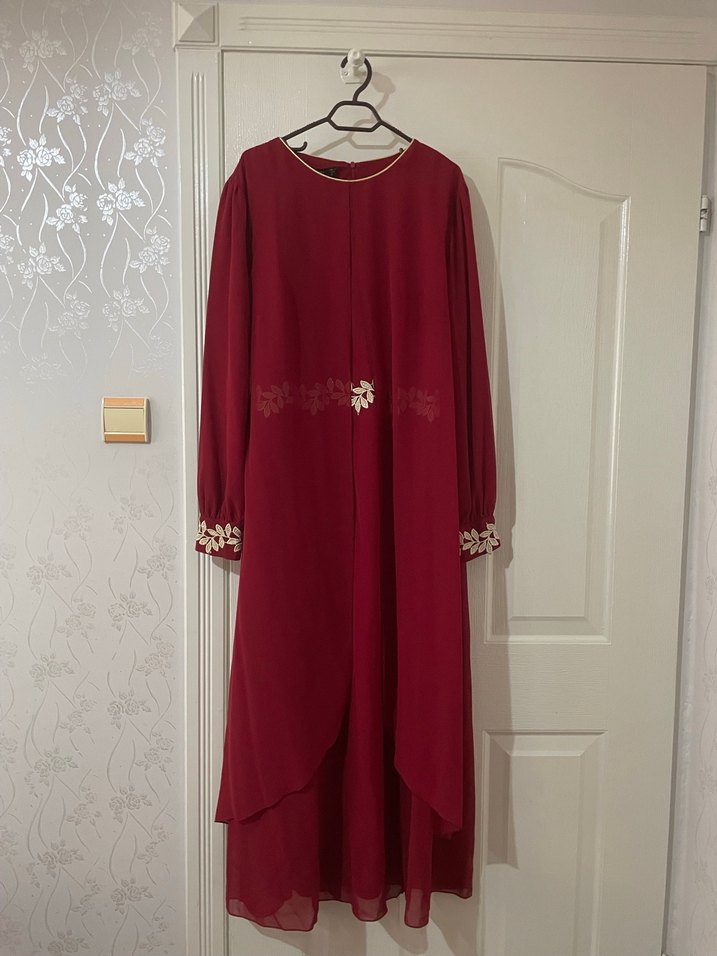 Bordo renkli, uzun kollu, yüksek yakalı, nakış detaylı, satenimsi kumaştan yapılmış, bol kesim ve drapeli uzun kadın elbisesi. Düğün için uygundur.
