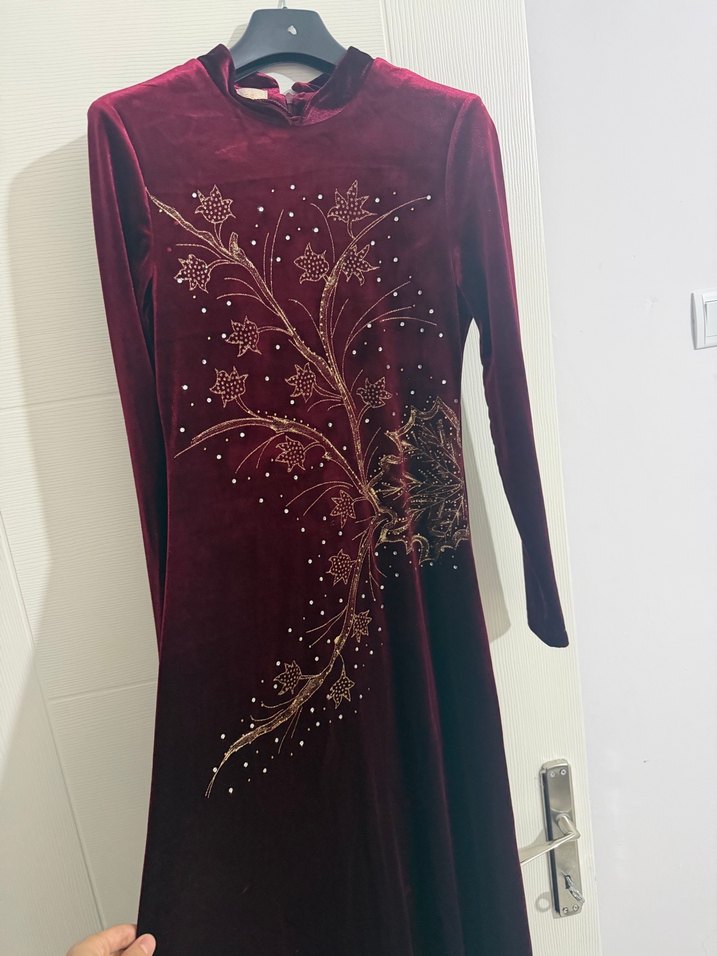 Bordo renkli, uzun kollu ve yüksek yakalı bu henna elbise, nakışlı çiçek desenleri ve drapeli detaylarla klasik ve bohem bir şıklık sunar. Kadife elbise 1 kere giyinildi
