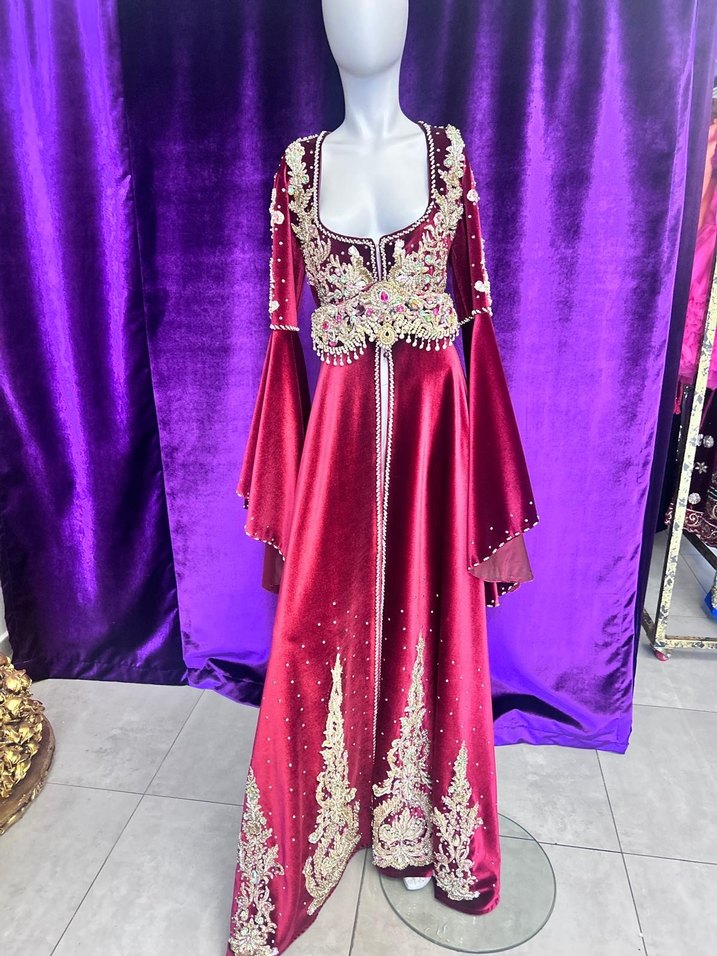 Bordo renkli, uzun kollu, bol kesim kına elbisesi. V yaka ve detaylı işlemeleri ile düğünlere uygun klasik şıklık sunar.