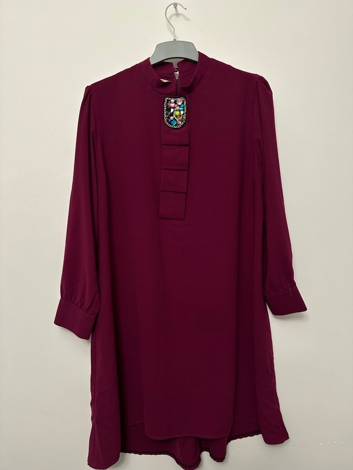 Bordo renkli, yüksek yakalı ve düğmeli ön kısmı ile nakış detaylı uzun kollu tunik. İpek gibi kumaştan, bol kesim ve vintage-bohem tarzına uygun, ofis için ideal.