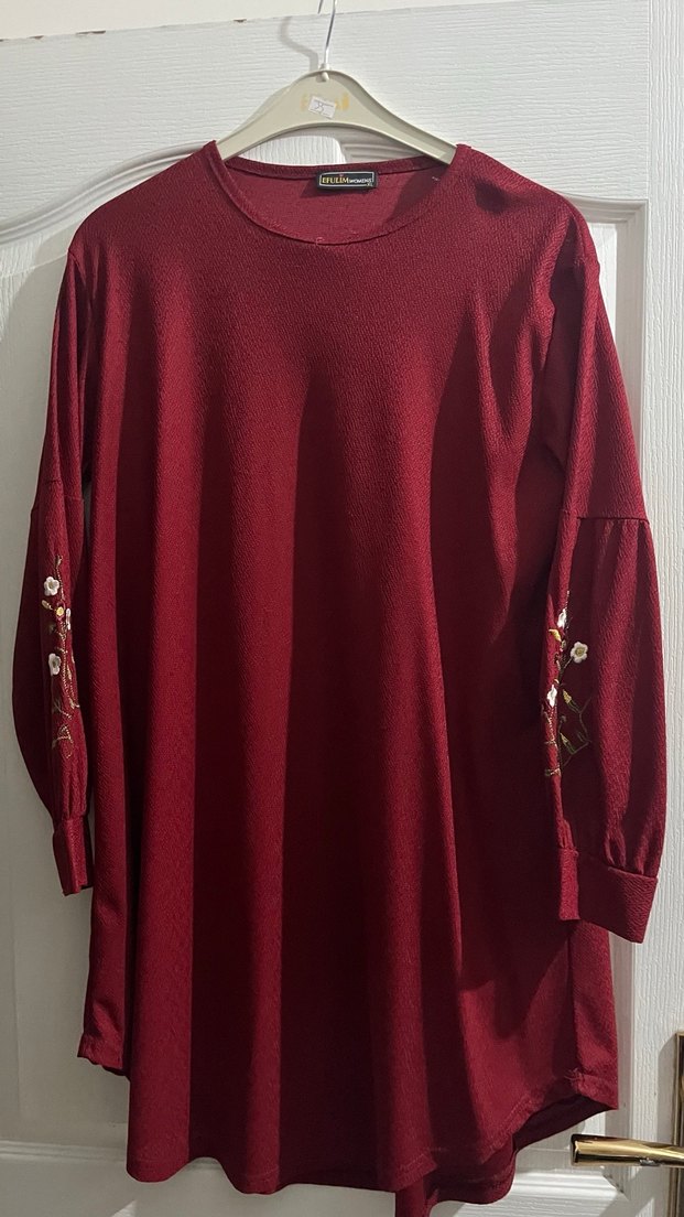 Bordo renkli, uzun kollu ve düğmeli manşetli, kollarında çiçek nakışlı salaş kesim tunik. Yumuşak ve sıcak kumaştan, rahat kullanıma uygun.