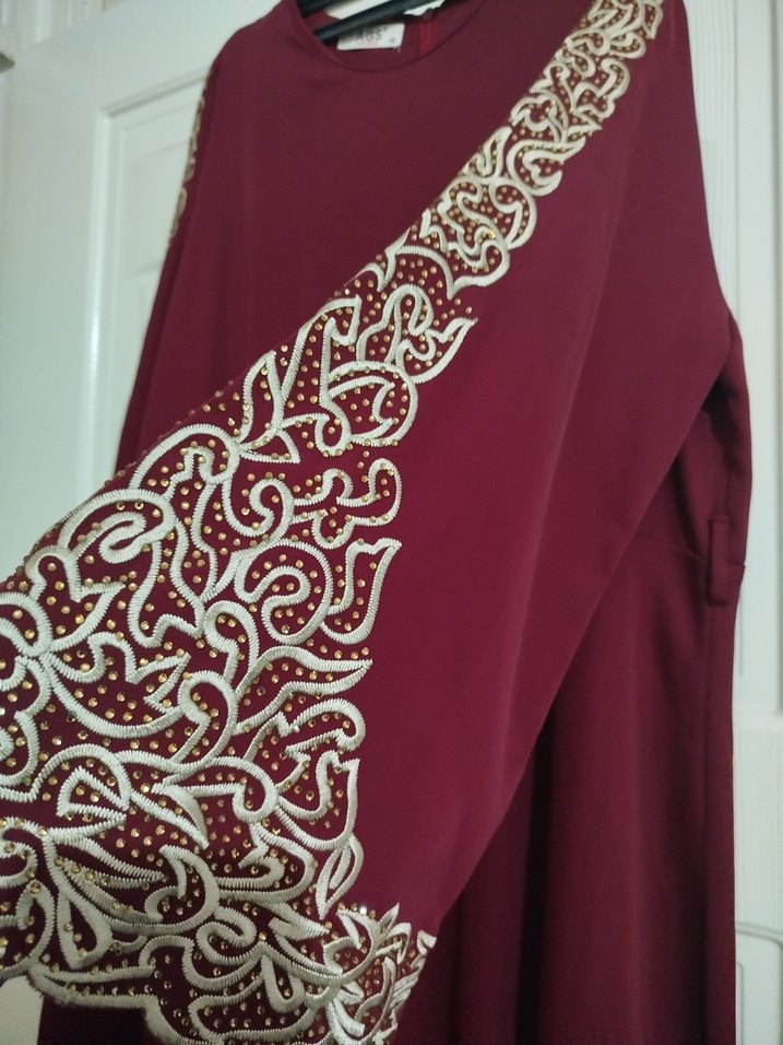 Bordo renkli, parlak kumaşlı, nakış işlemeli, drapeli uzun kollu, V yakalı, bol kesim tesettür abiyedir. Düğün için uygundur.