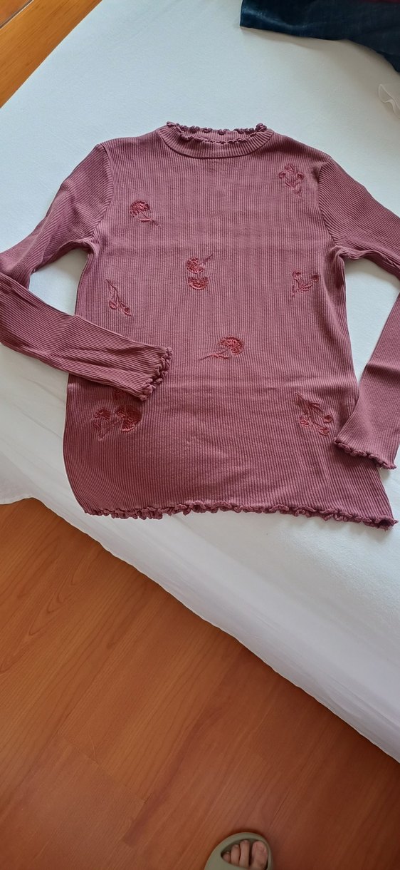 Bordo renkli, uzun kollu, yuvarlak yaka triko kazak. Nakış detayları ve rahat, bol kesimiyle günlük kullanıma uygun, midi boyda örme kumaş.