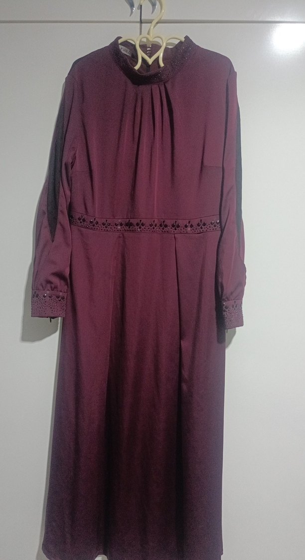 Bordo renkli, yüksek yakalı ve uzun kollu bu uzun elbise, nakışlı detaylara ve drapeli tasarıma sahiptir. İpek gibi kumaştan, düğünler için uygundur.
