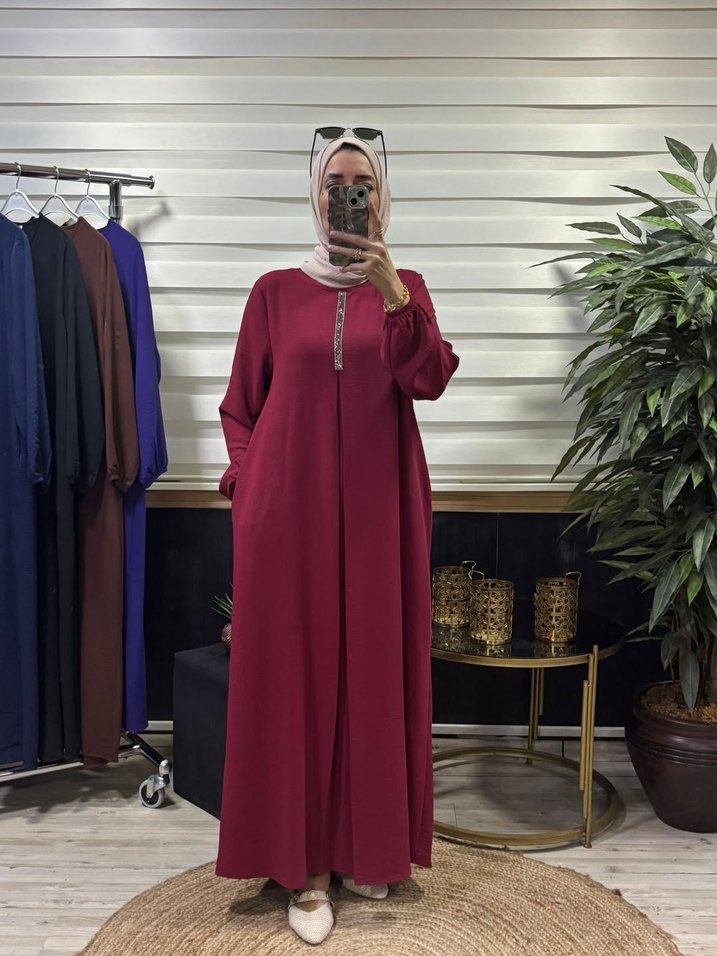 Bordo renkli, yüksek yakalı ve uzun kollu bu elbise nakışlıdır. İpek gibi dokusu ve salaş kesimiyle sade, günlük kullanıma uygundur.