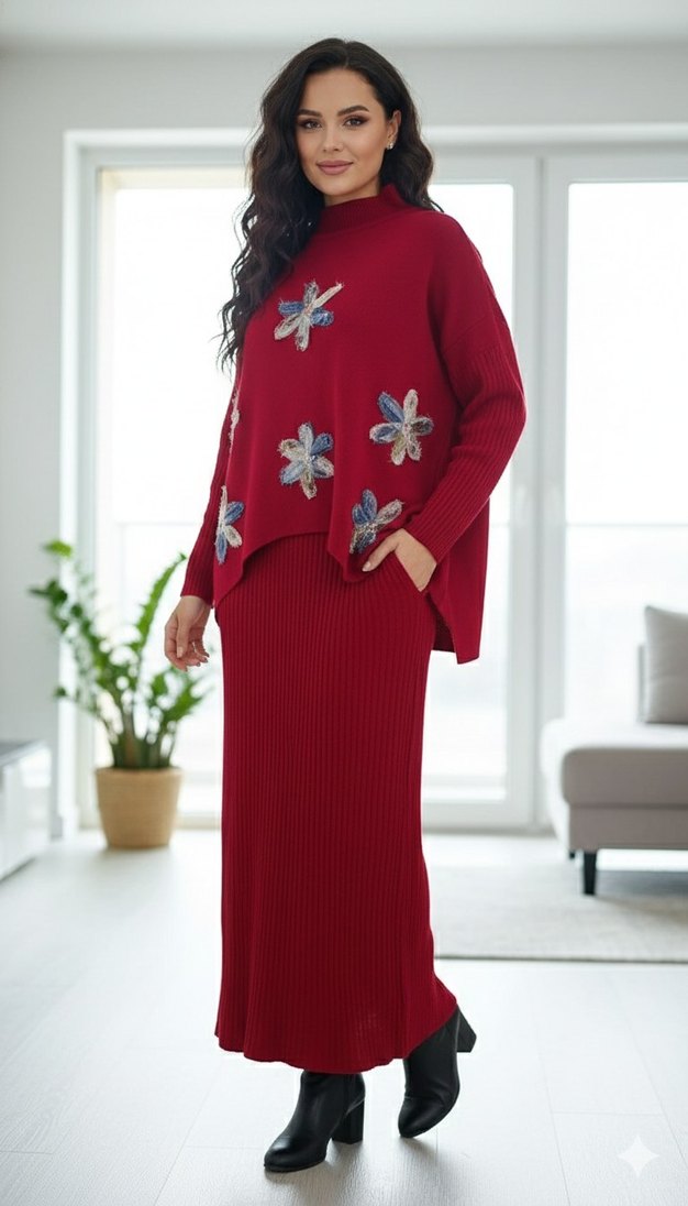Bordo renkli, uzun triko elbise, bol kesim ve nakışlı çiçek desenleriyle rahat ve şık bir görünüm sunar.
