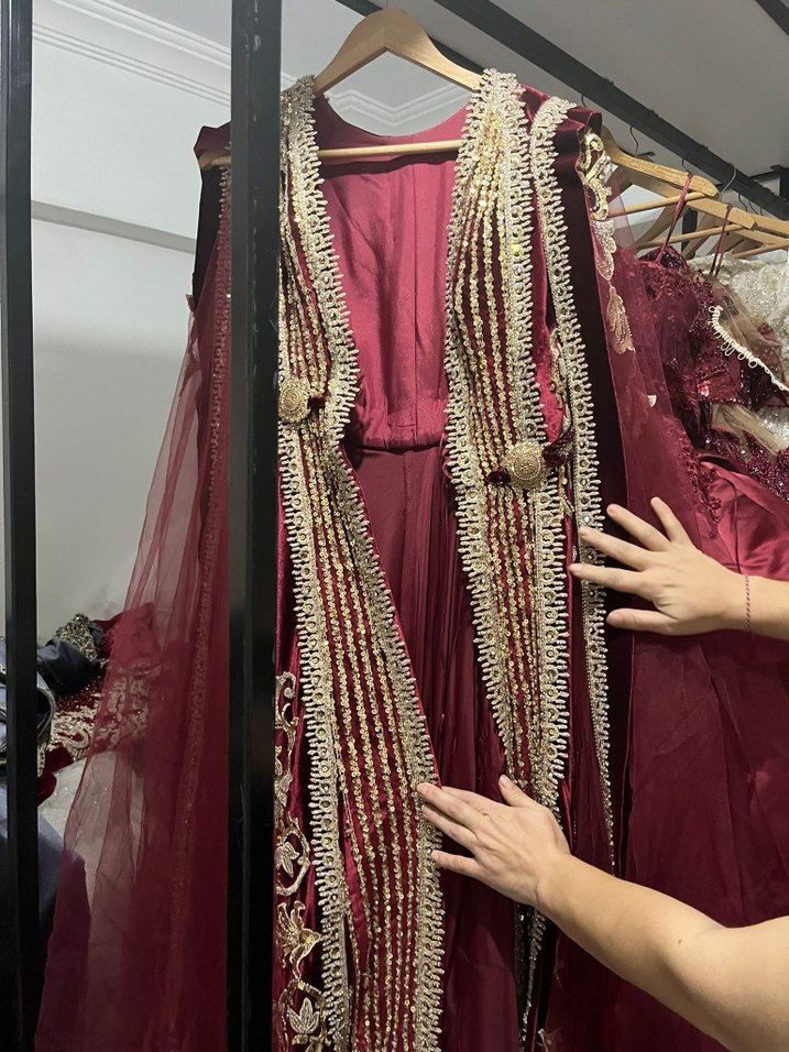 Bordo renkli, uzun ve drapeli, nakış detaylı, V yakalı ve askılı kollu, avant-garde tarzda kadın hint elbisesi.