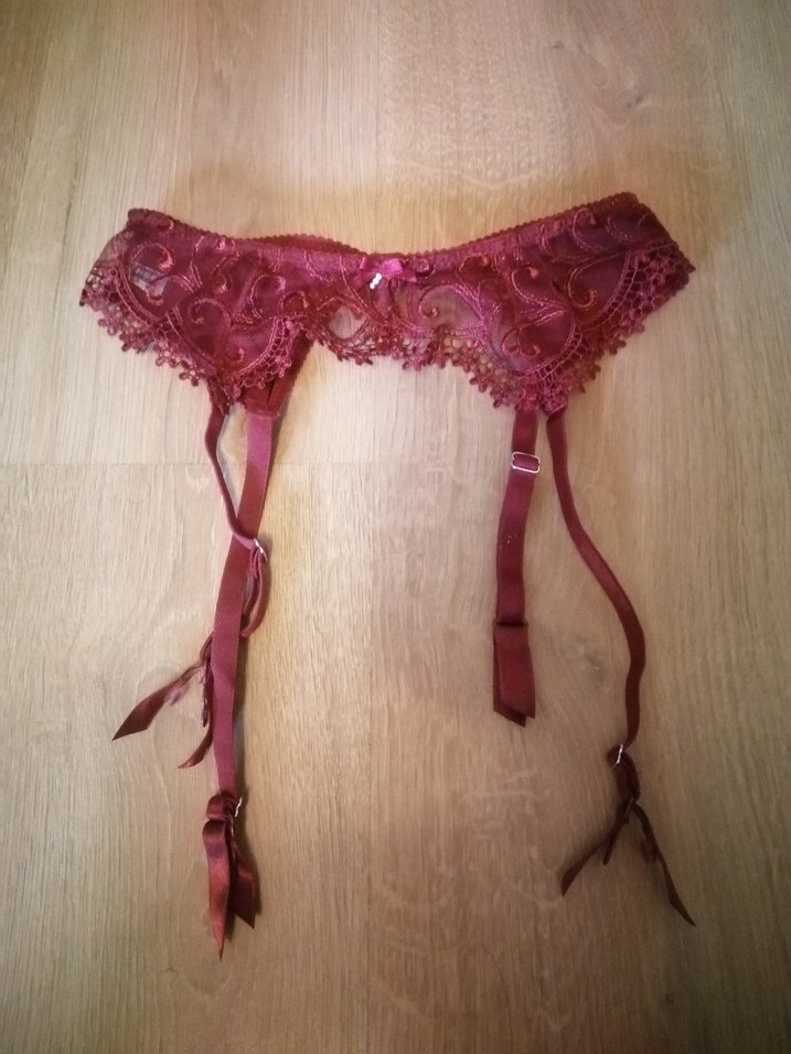 Bordo renkte, nakışlı ve vintage bohem tarzda, ayarlanabilir askılı jartiyerdir.