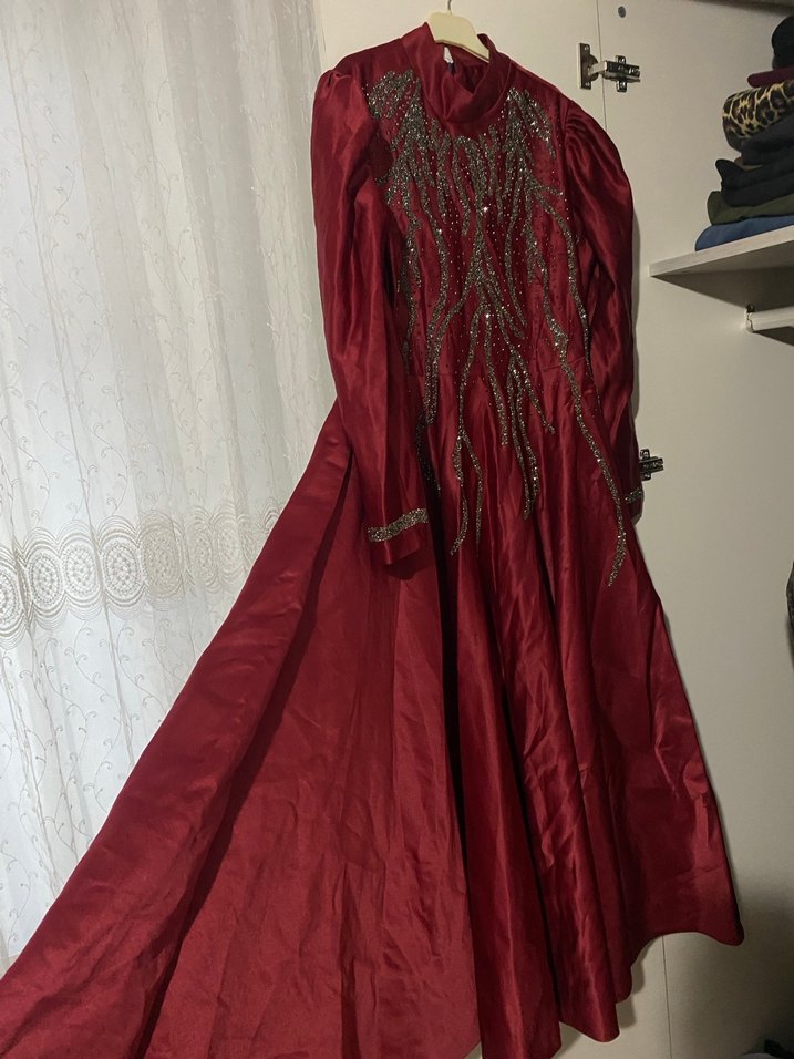 Bordo renkli, yüksek yakalı ve uzun kollu bu vintage abiye elbise, nakışlı ve drapeli detaylarla klasik şıklık sunar.