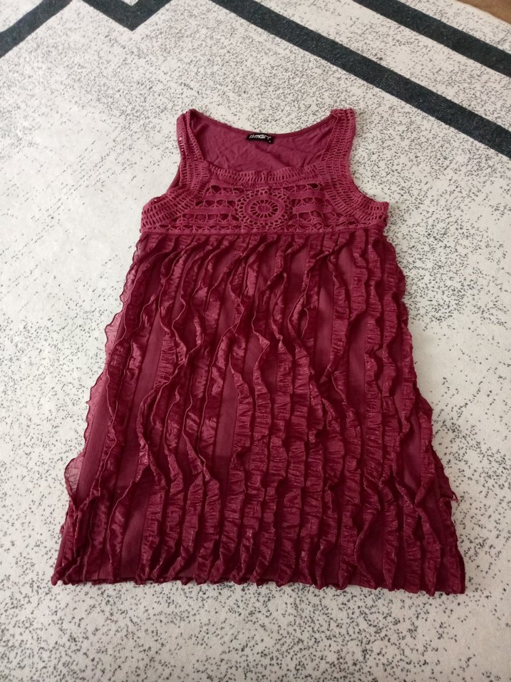 Nakışlı detaylar ve volanlı tasarıma sahip bordo kolsuz, bol kesim bohem tarzda örme elbise. Günlük kullanıma uygundur.