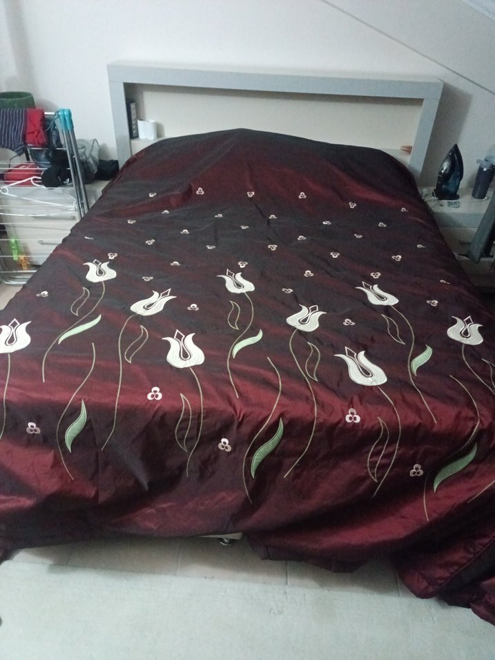 Bordo renkli, yeşil saplı nakışlı çiçek desenlerine sahip yatak örtüsü. 275'x260 ölçüleri yatağı kaplaması çok güzel