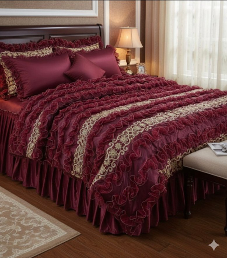 Bordo renkte, nakışlı ve fırfırlı detaylara sahip yatak örtüsü, odanıza şık ve zengin bir görünüm katar. sadece yatagın üzerindeki örtü vardır