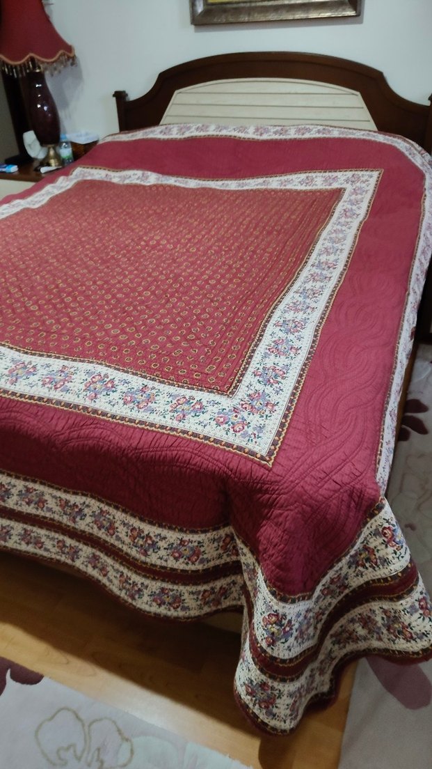 Koyu bordo renkte, kenarlarında ve ortasında detaylı nakışlı çiçek desenleri bulunan yatak örtüsü, klasik bir dokunuş sağlar.