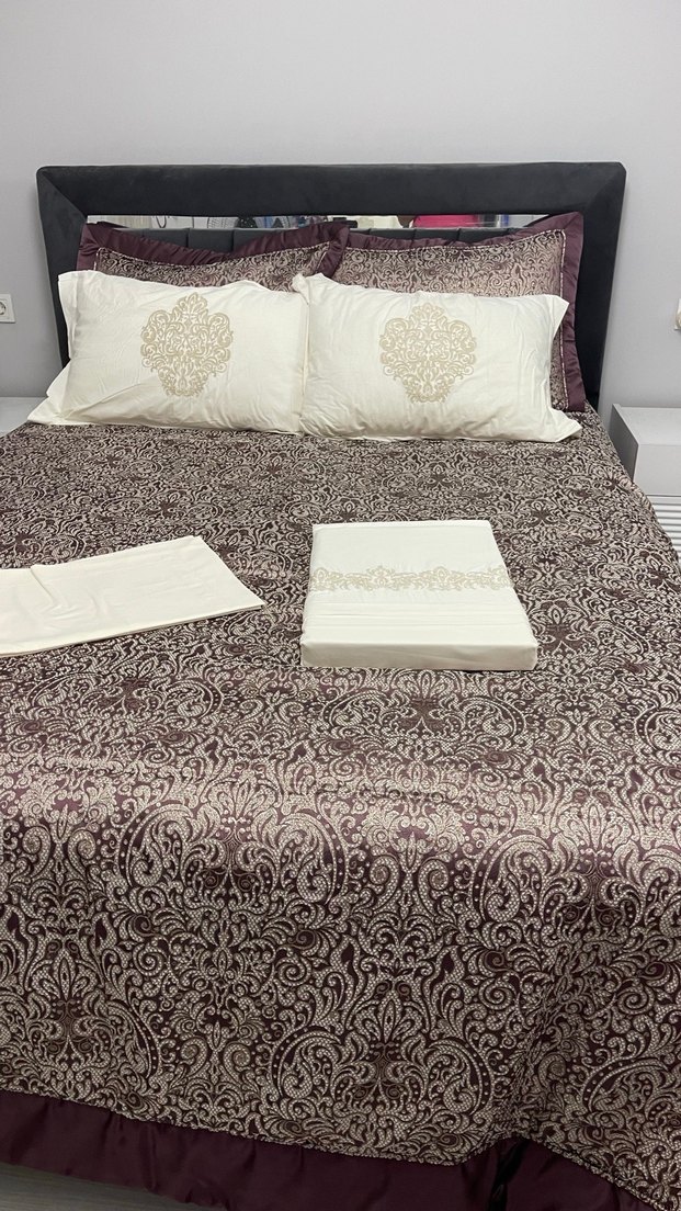 Koyu bordo renkte, zarif nakışlı desenlere sahip yatak örtüsüdür. Uyumu sağlayan nakışlı yastık kılıfları ve çarşaf seti ile birlikte sunulur. ️
